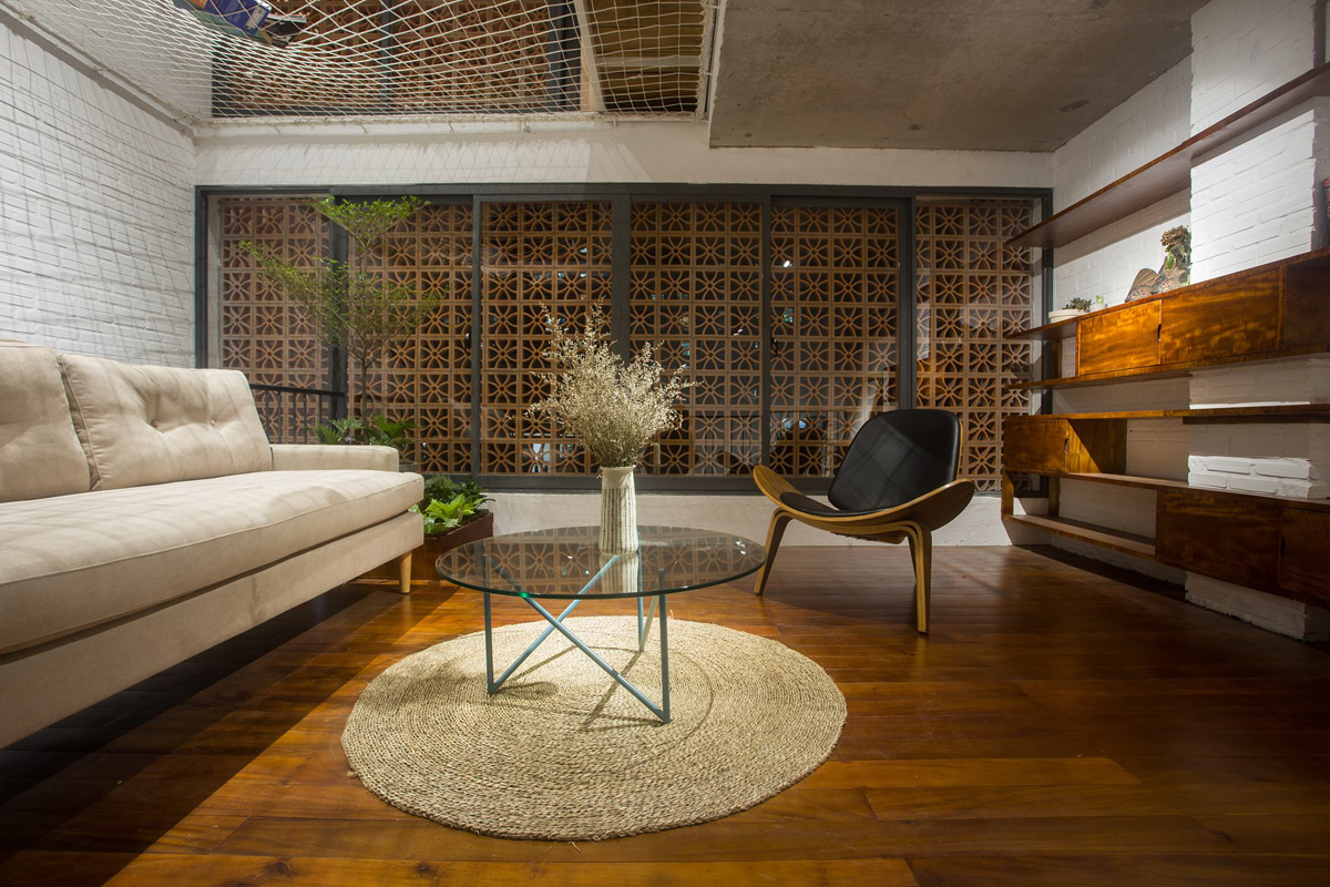 Thay vì dùng tường ngăn như thông thường, các kiến trúc sư Đào Hưng, Liêm Nguyễn, Lê Hoàng (AHL Architects) quyết định dùng hệ thống tủ đồ để phân chia ước lệ các không gian sử dụng cho 2 phòng ngủ, bếp, ăn, sinh hoạt chung.
